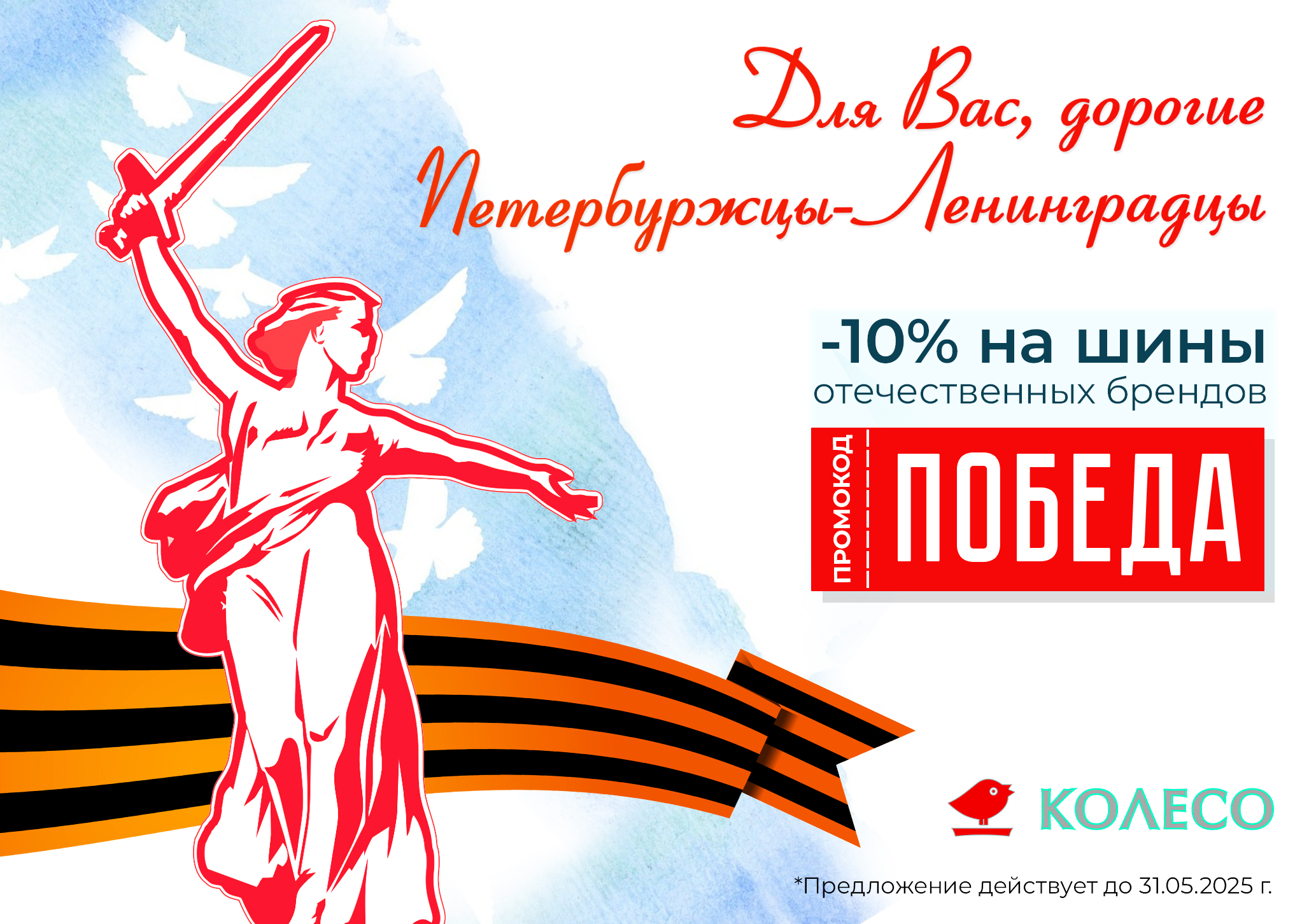 В честь юбилея, весь май дарим 10% от стоимости на шины отечественных брендов по промокоду "ПОБЕДА". Желаем Вам приятных покупок!