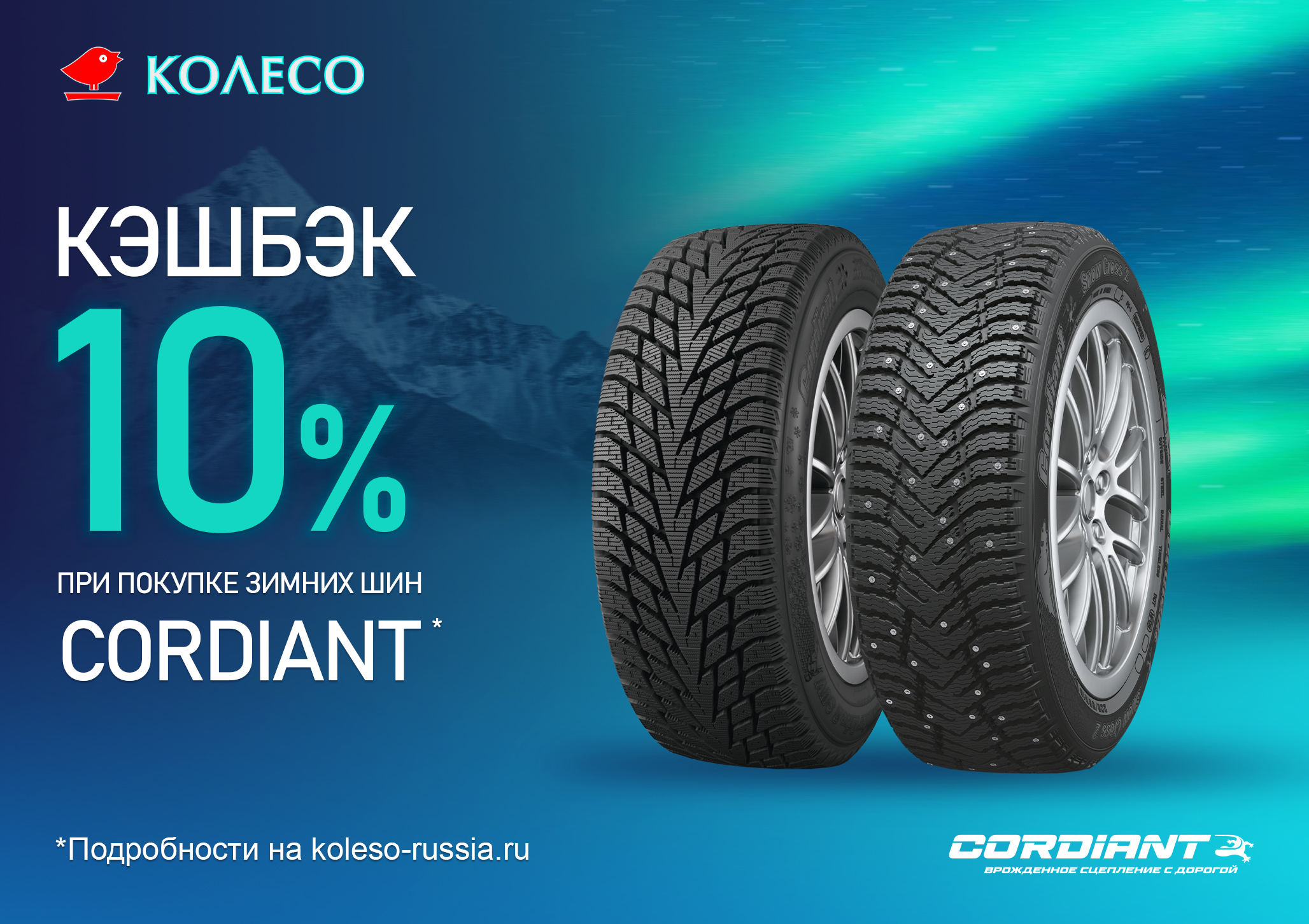 КЭШБЭК 10% при покупке зимнего комплекта шин Cordiant