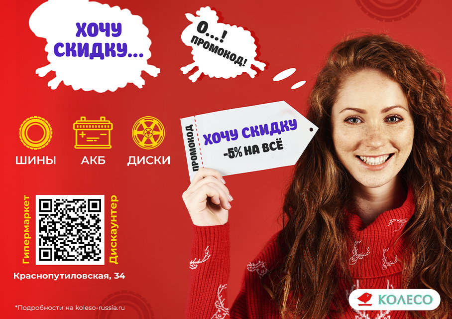 Назовите промокод на кассе в магазине в момент оплаты. Промокод действует на все шины, диски, аккумуляторы только в шинном гипермаркете «Колесо» по адресу: Краснопутиловская улица, 34.